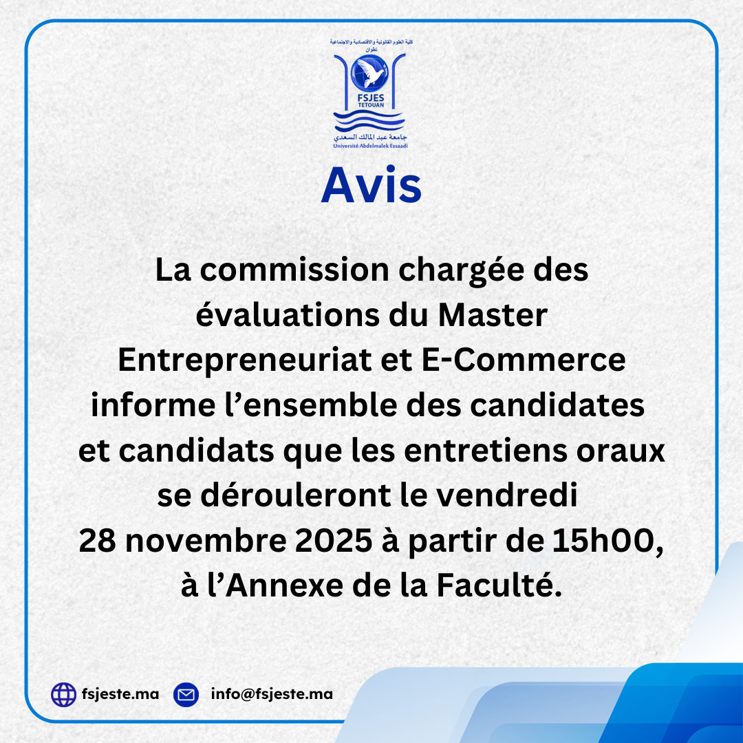La Faculté des Sciences Juridiques, Économiques et Sociales de Tétouan (FSJES Tétouan), lance Résultats Présélection Masters et Masters spécialisés 2025-2026.